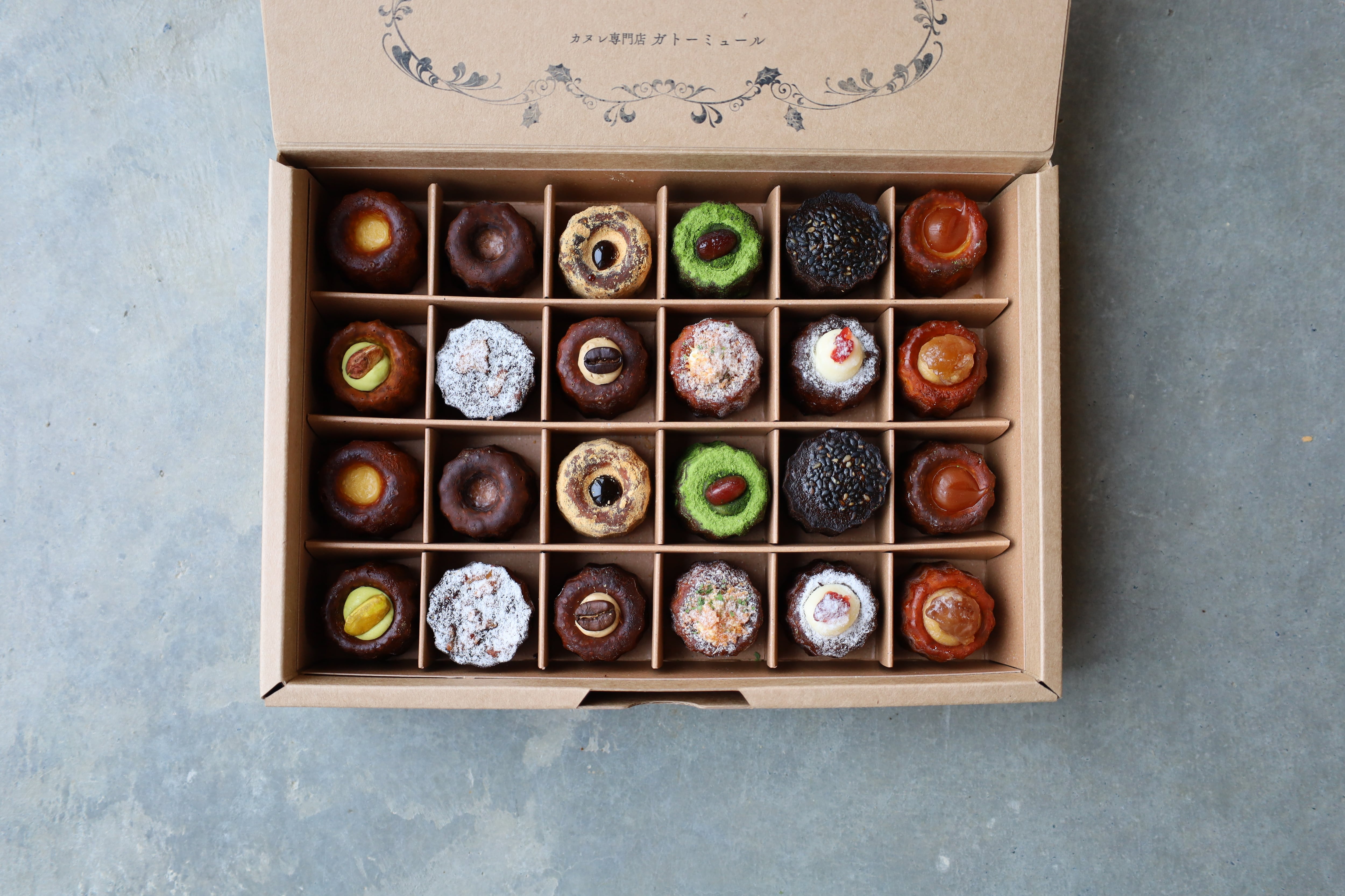 バニーユ/ショコラ/西尾の抹茶/黒蜜きな粉/キャラメル・サ・レ/ピスタチオ/黒ごま/黒糖とくるみ/バナーヌ/カフェ+季節のカヌレ2種 の計12種類